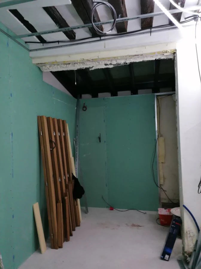 Ce n’est pas le seul élément de l’immeuble qui a été conservé, puisque le plafond possédait encore ses vieilles poutres en bois comme trace du passé. Pour leur donner de la valeur, nous avons intercalé du papier peint avec un dessin du XVIIIe siècle.