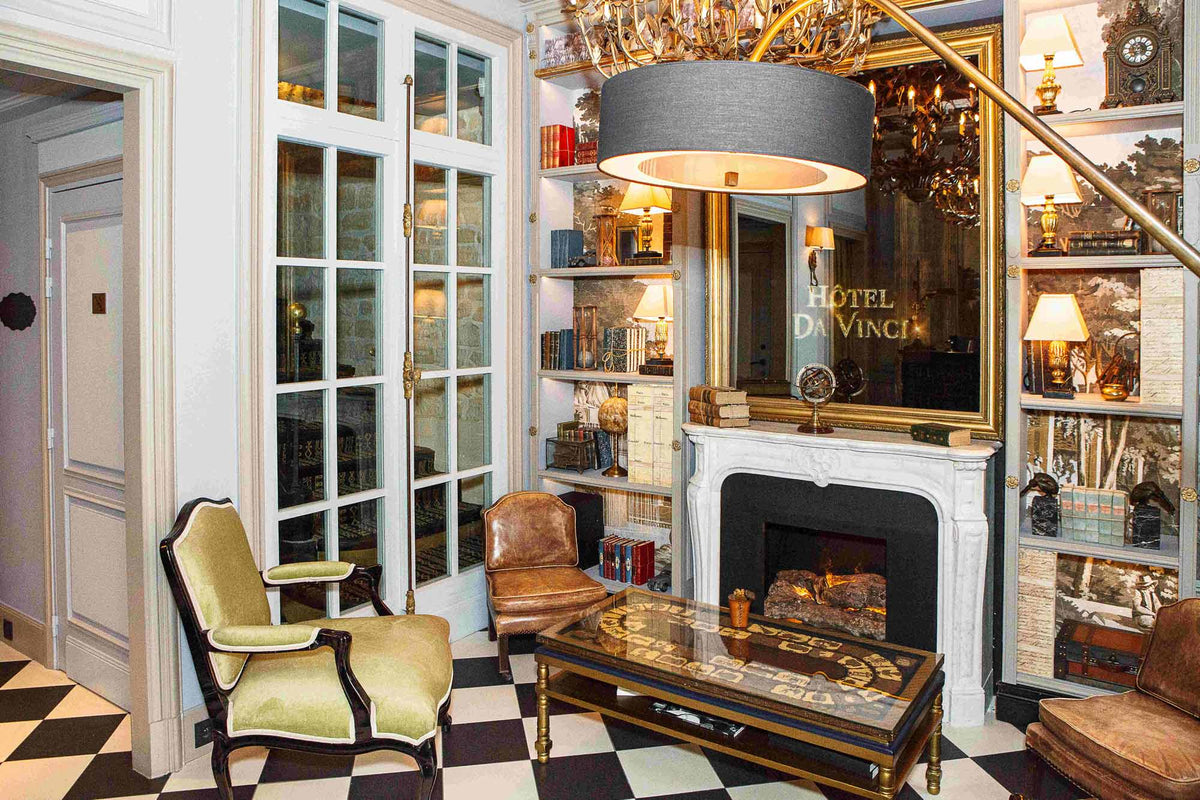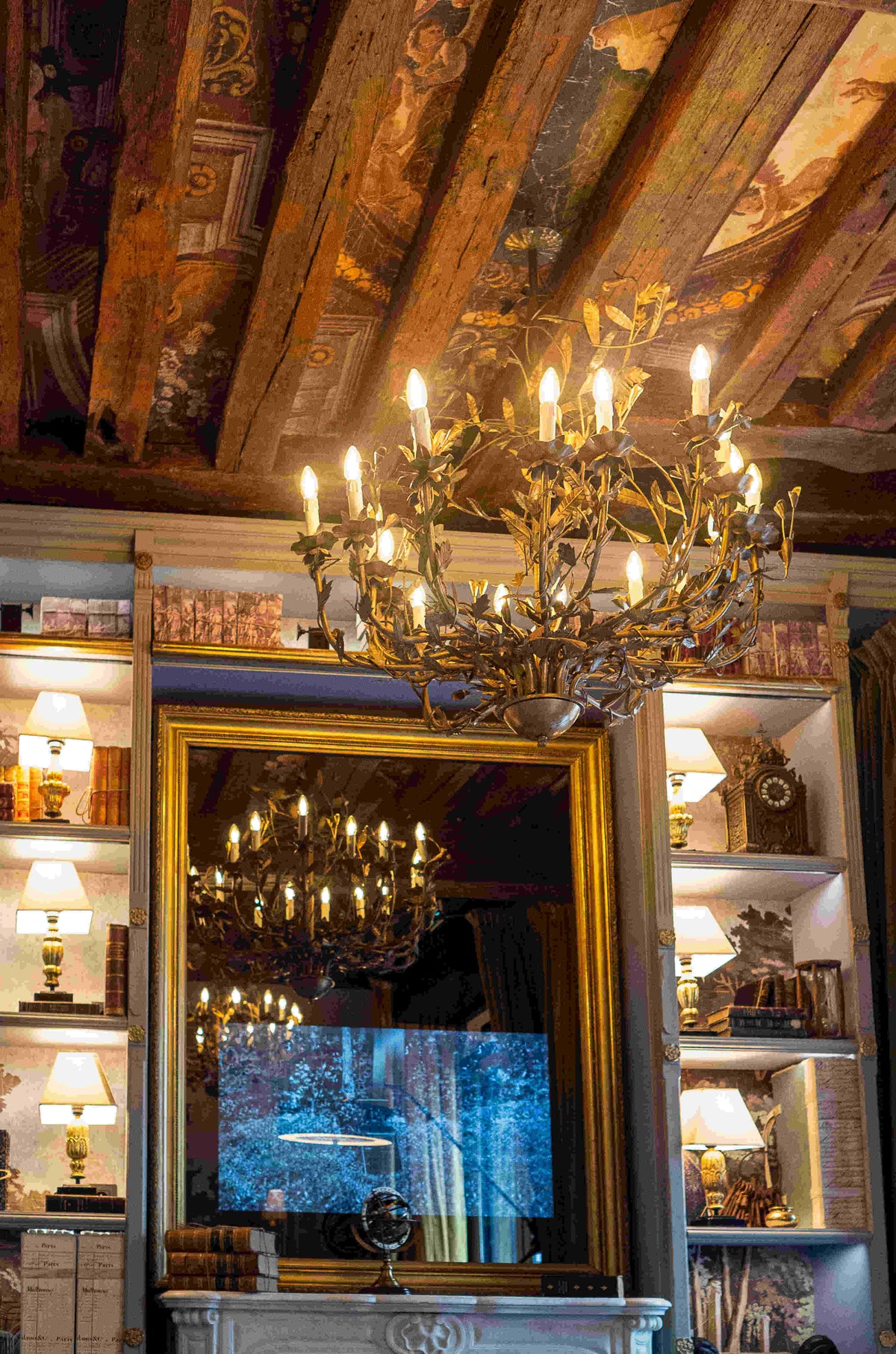 Pour créer cette atmosphère, nous avons disposé nos fauteuils Brienne, tapissés d’un velours vert pâle qui apporte une touche de couleur. Les lustres Elysée Maintenon, dorés à la feuille d’or, offrent une lumière très douce qui renforce les éléments de décoration.