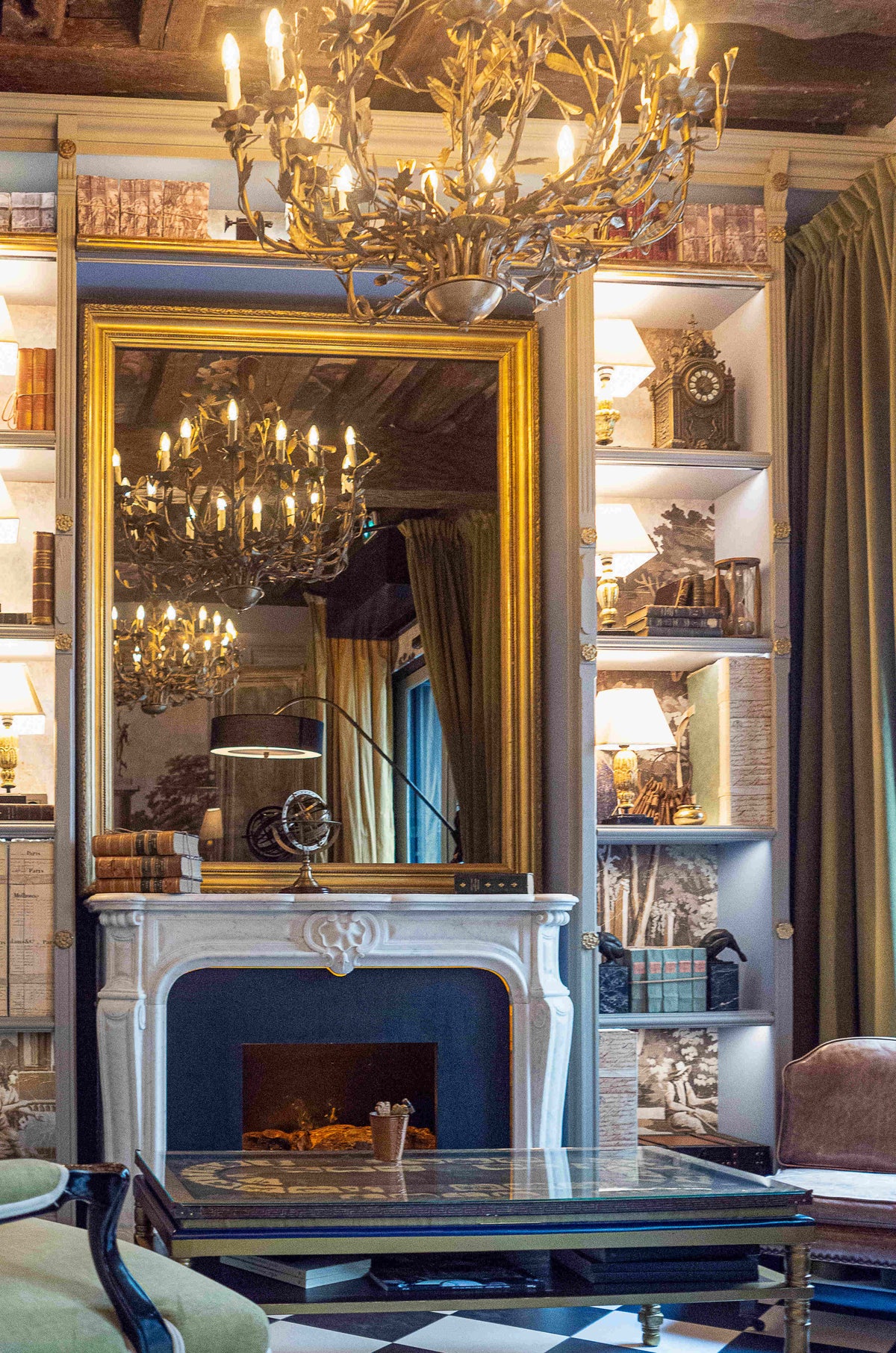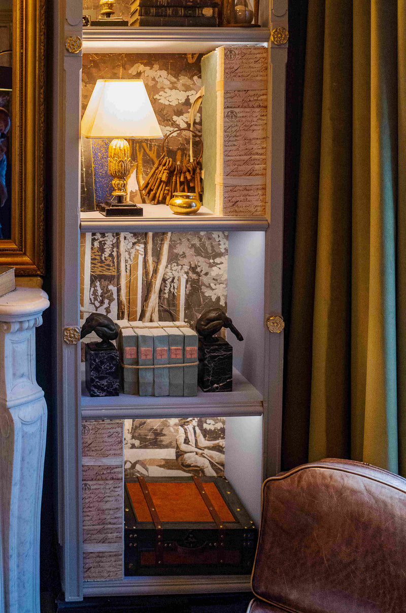 Au-dessus de la cheminée en marbre, nous avons disposé un miroir ancien qui agrandit encore un peu plus cette pièce. La bibliothèque qui les entoure a été réalisée sur mesure dans nos ateliers, avec des éléments anciens.