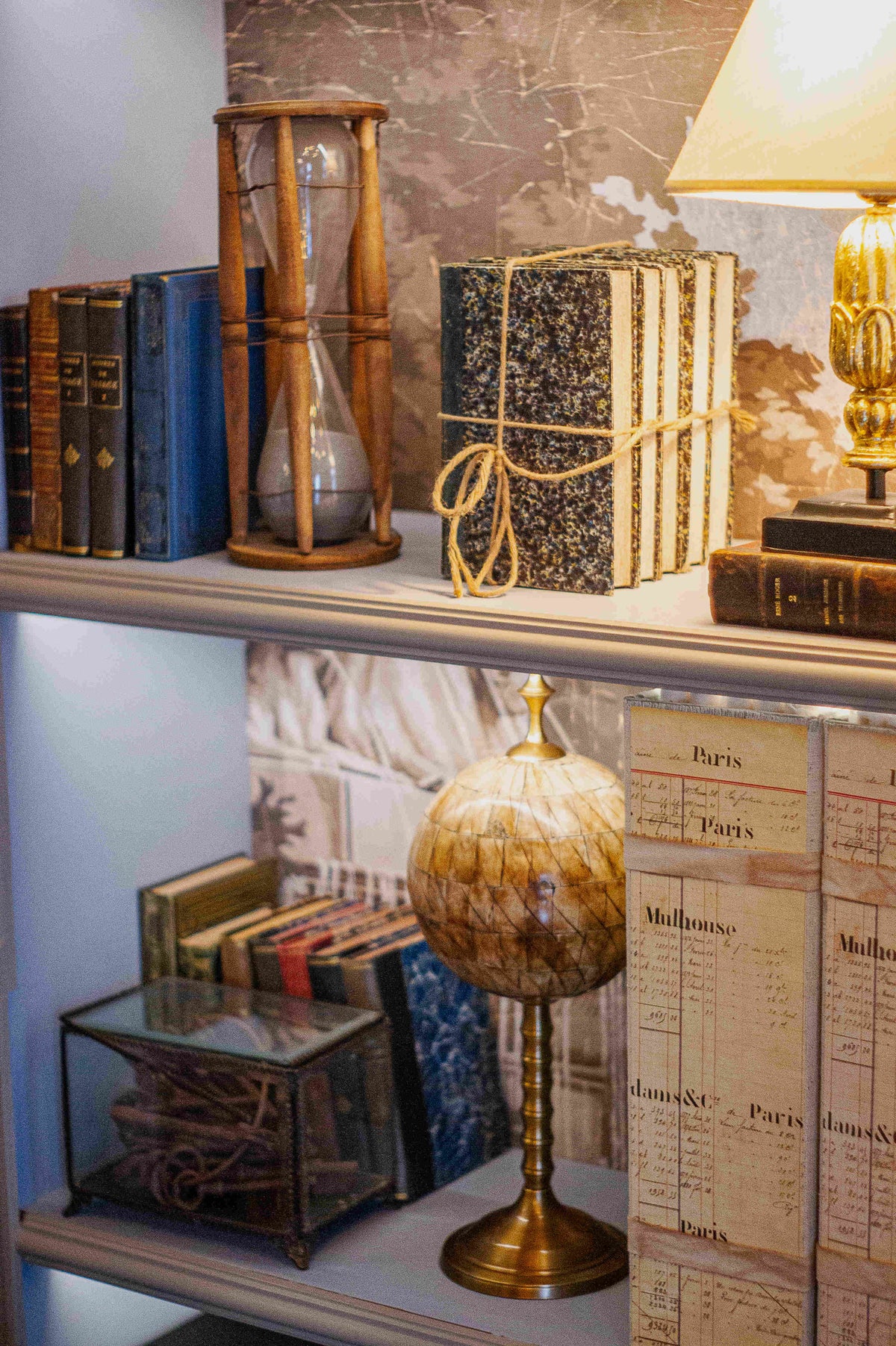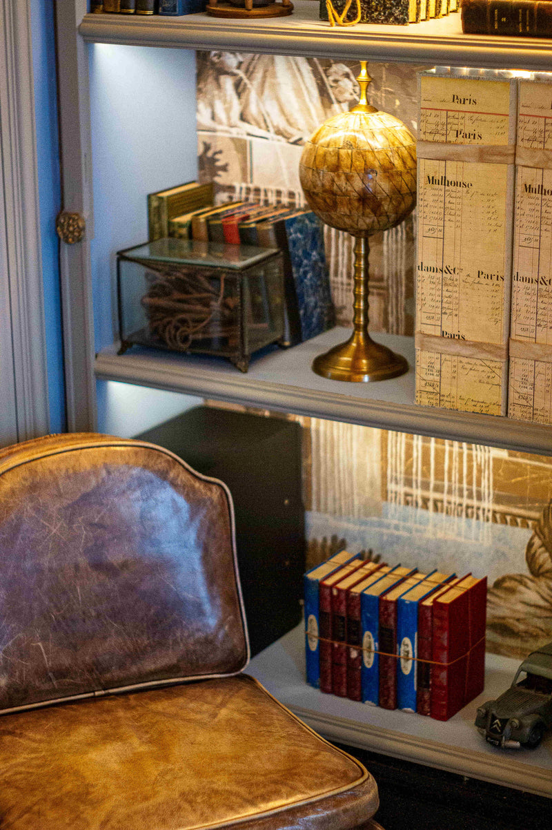 Du côté des accessoires décoratifs, on retrouve une sphère armillaire, une horloge de table, des lampes de chevet illuminant la bibliothèque, une valise vintage, des sabliers authentiques et de belles pièces comme un serre-livres atypique. En plus de faire la différence, ils renforcent l’unité de la pièce.