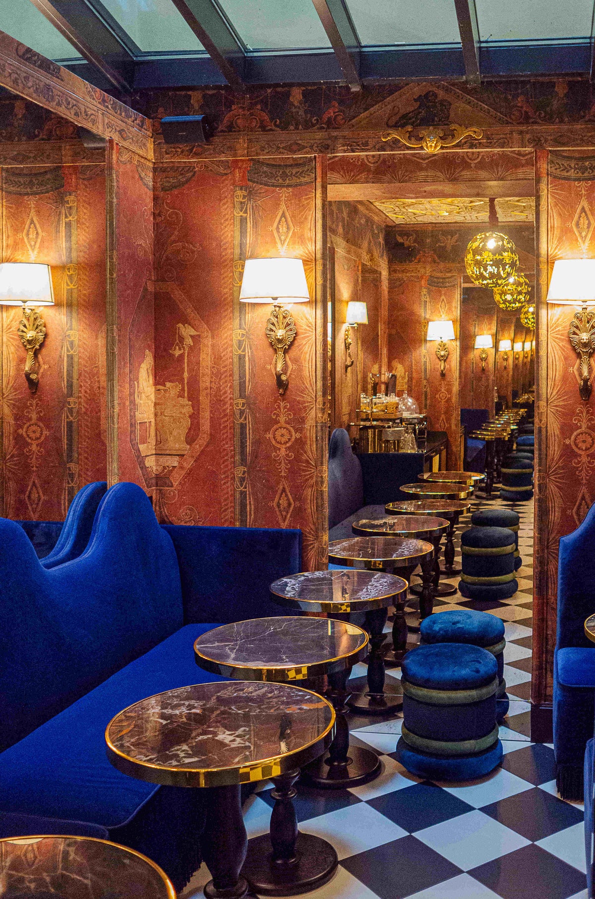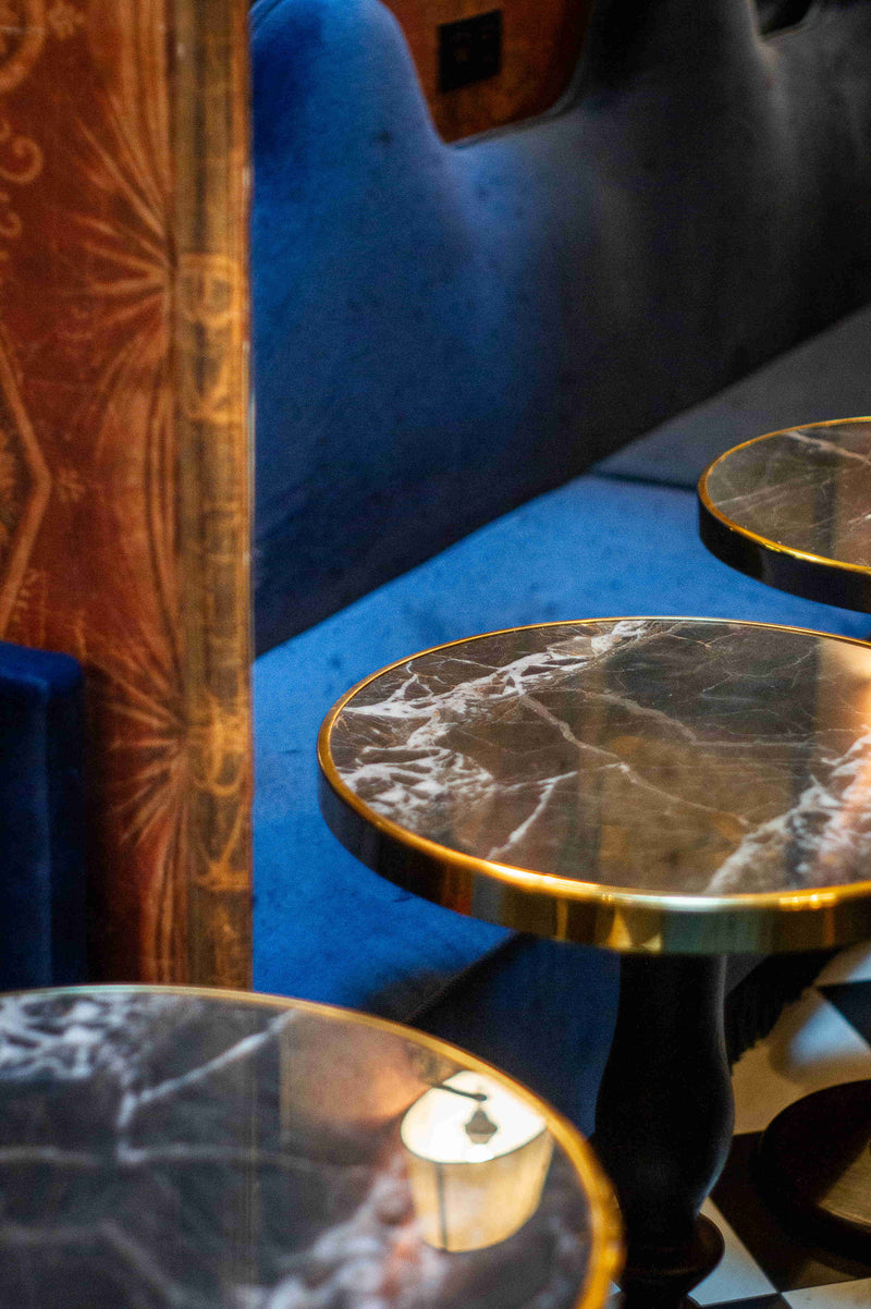 Pour une meilleure expérience des repas et pour coller à l’univers de l’hôtel, nous avons opté pour des tables de bar à l’aspect chic et des assises en velours confortables. Contre le mur, des banquettes bleues invitent à la détente et la contemplation du lieu. et des poufs faits pour l’occasion complètent les assises.
