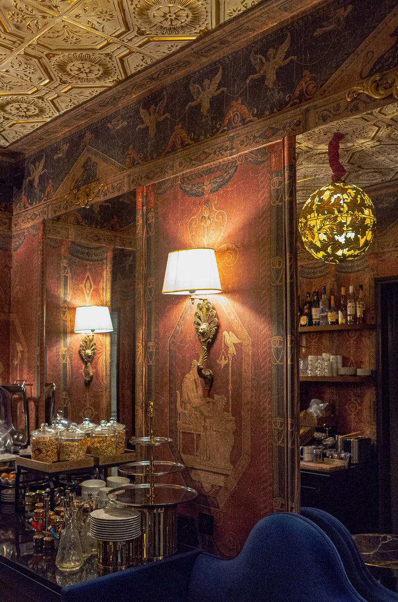 Tout d’abord, de hauts miroirs ont été installés. Ils sont encadrés et mis en valeur par un papier peint au décor pompéien, spécialement réalisé par Mis en Demeure à partir de dessins anciens pour l’hôtel Vinci Due.
